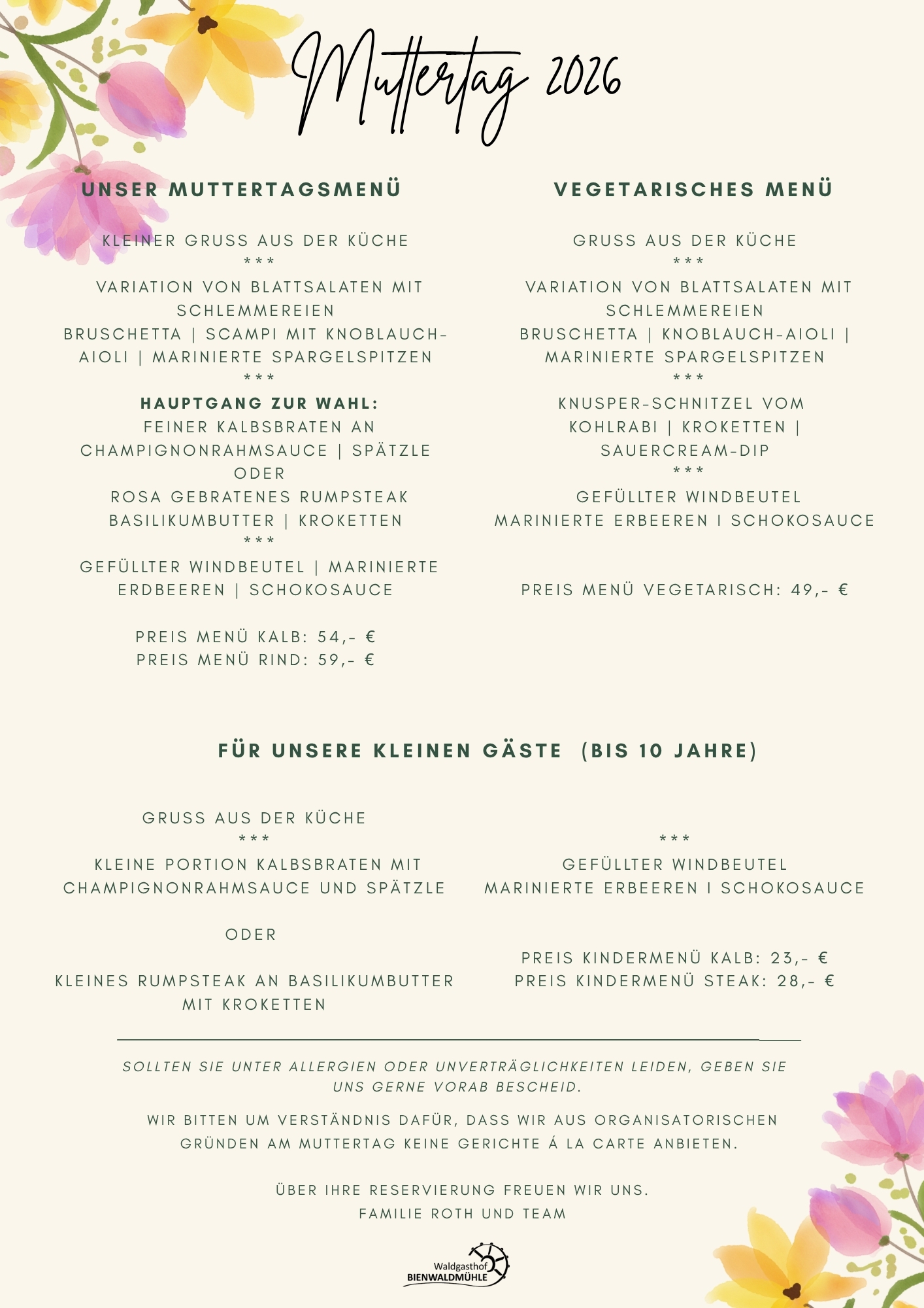 Für diesen besonderen Tag haben wir ein liebevoll zusammengestelltes Menü für Sie vorbereitet. Bitte haben Sie Verständnis, dass wir keine Gerichte à la carte anbieten.