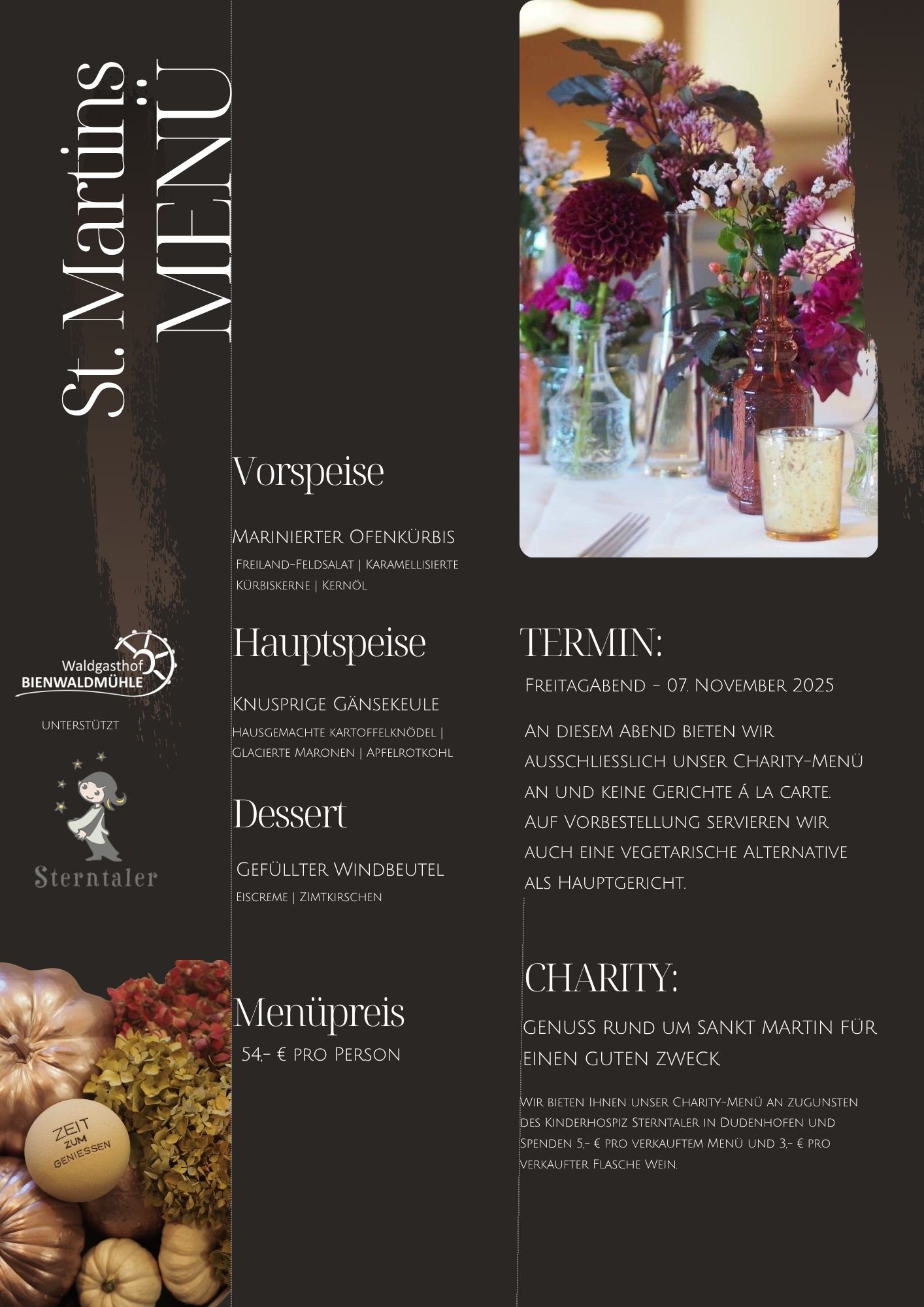 auch in diesem Jahr bieten wir wieder unser Sankt-Martins-Charity-Menü an. Freuen Sie sich auf ein genussvolles Menü in stimmungsvoller Atmosphäre – und unterstützen Sie dabei das Kinderhospiz Sterntaler in Dudenhofen.