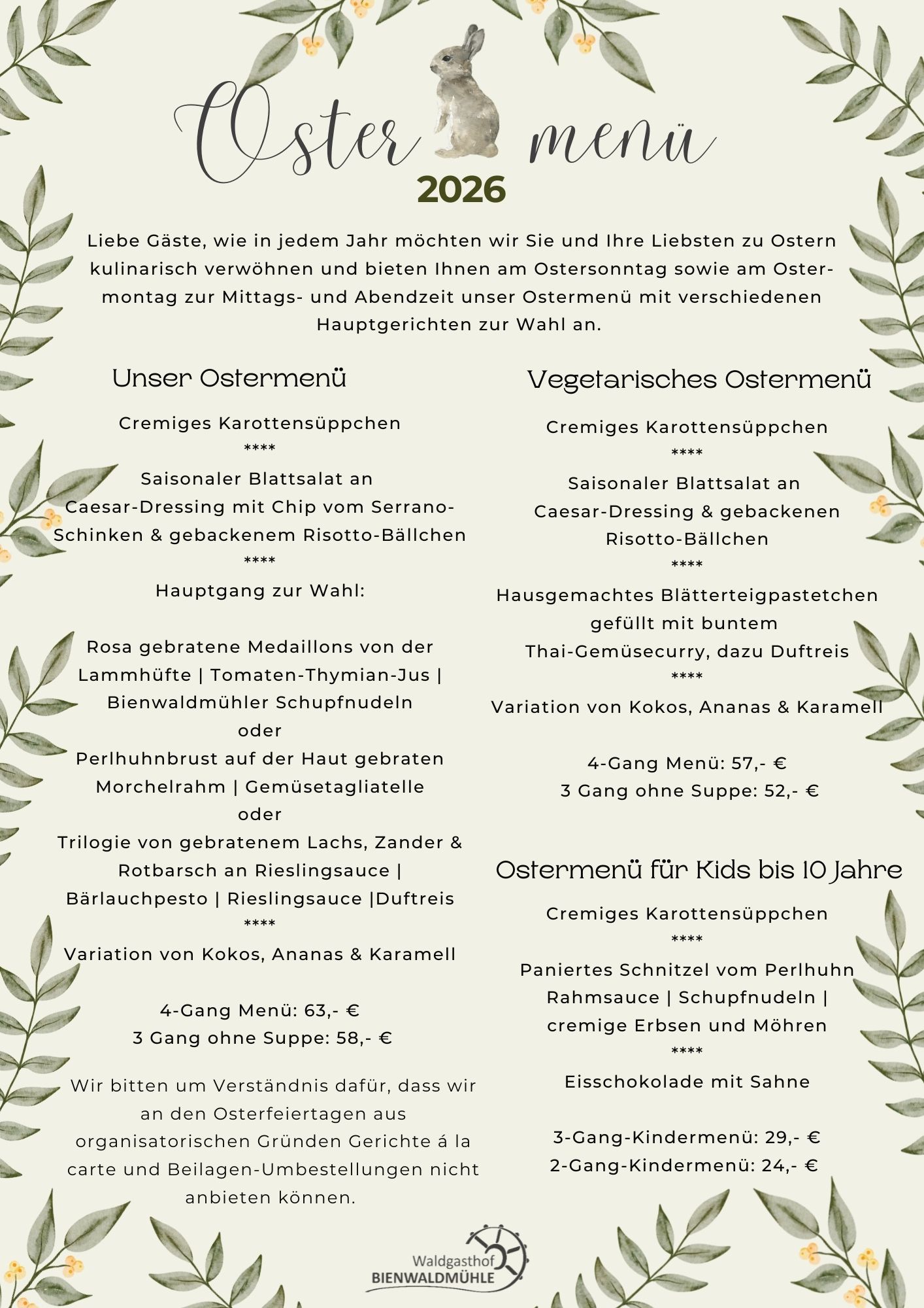 Um Ihnen an den Osterfeiertagen bestmöglichen Service und eine gleichbleibend hohe Qualität bieten zu können, haben wir uns für ein festliches Ostermenü entschieden und bieten an diesen Tagen keine Gerichte à la carte an. Wir bitten außerdem um Ihr Verständnis, dass innerhalb der Menüs keine Änderungen oder Umbestellungen von Beilagen vorgesehen sind.